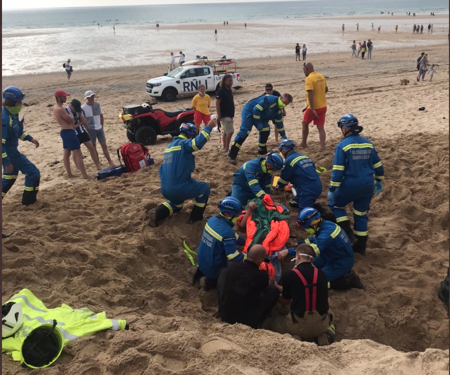 Amigos do adolescente, guarda-vidas, policiais e turistas ajudaram a resgatá-lo do buraco que ele mesmo havia cavado. Imagem de resgate em uma praia da cidade de Newquay, em 1º de julho de 2021