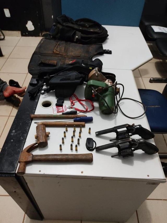 Com o adolescente foram encontradas duas armas e várias ferramentas que estavam sendo utilizadas na tentativa de violar o cofre. Ele foi levado para a central de Flagrante da Delegacia de Polícia Civil junto com material utilizado no crime.