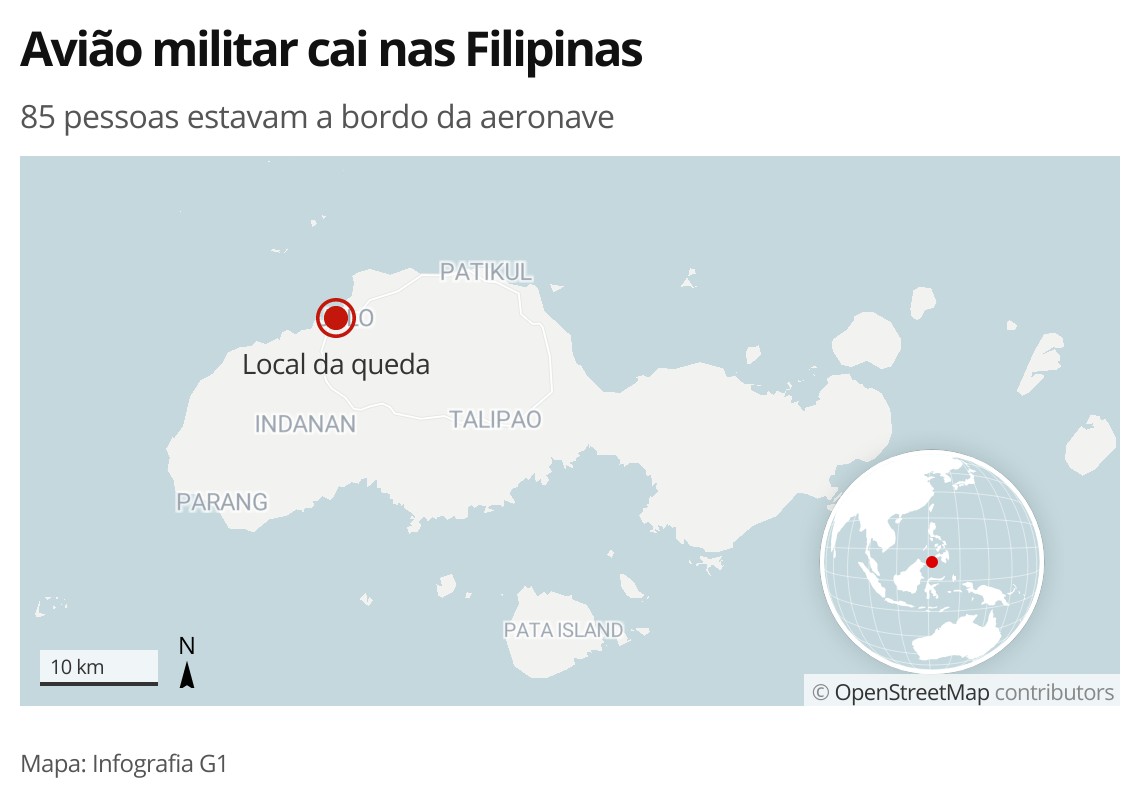 Aeronave tentava pousar na ilha de Joló, na província de Sulu. Segundo as Forças Armadas do país, 15 pessoas foram resgatadas no local. Um avião militar com 85 pessoas a bordo caiu neste domingo (4) no sul das Filipinas, informou o chefe das Forças Armadas.