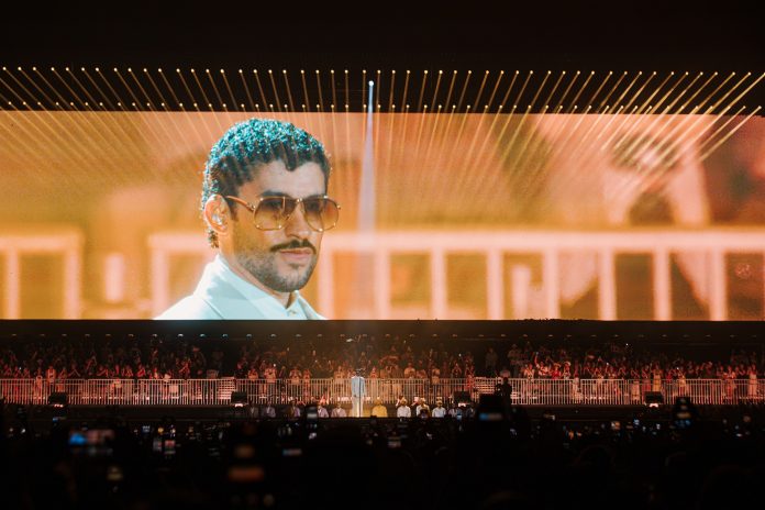 A apresentação é dividida em atos bem marcados, sem tantas surpresas. Até o recurso comum em turnês de outros popstars está lá: Bad Bunny reserva um espaço do setlist para uma faixa exclusiva em cada show. No finalzinho da segunda parte, canta “Vete”.