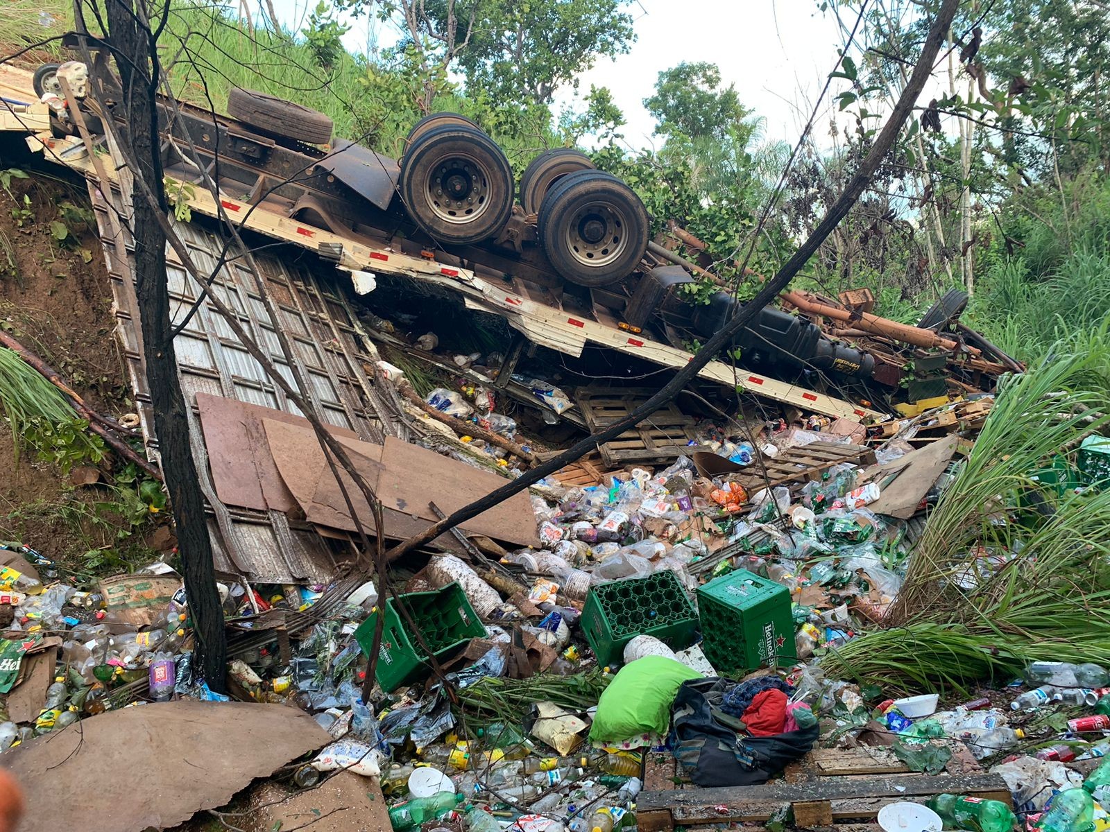 Conforme as imagens divulgadas, é possível ver que a carga que estava no caminhão também acabou sendo arremessada no penhasco.