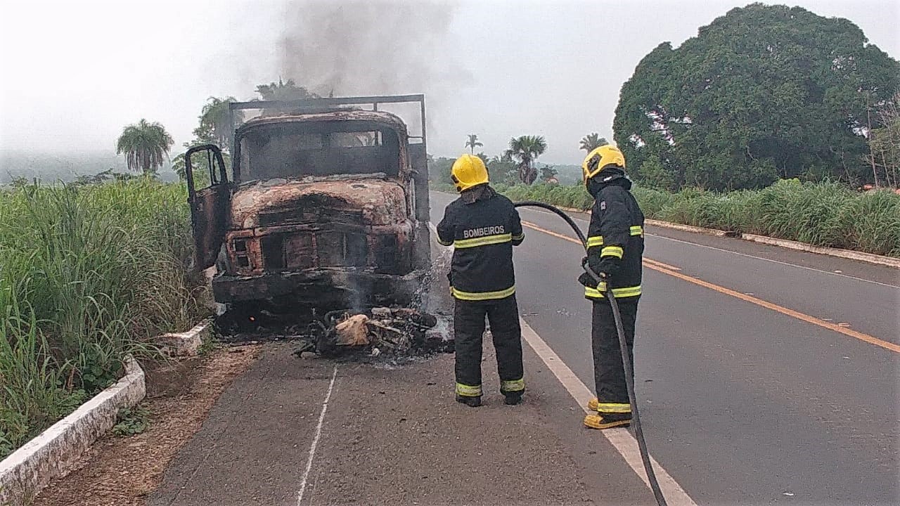 A moto ficou completamente destruída com o incêndio. E ao chegar, os bombeiros militares ainda conseguiram controlar parte das chamas que consumiam a carroceria do caminhão. A cabine foi atingida totalmente.