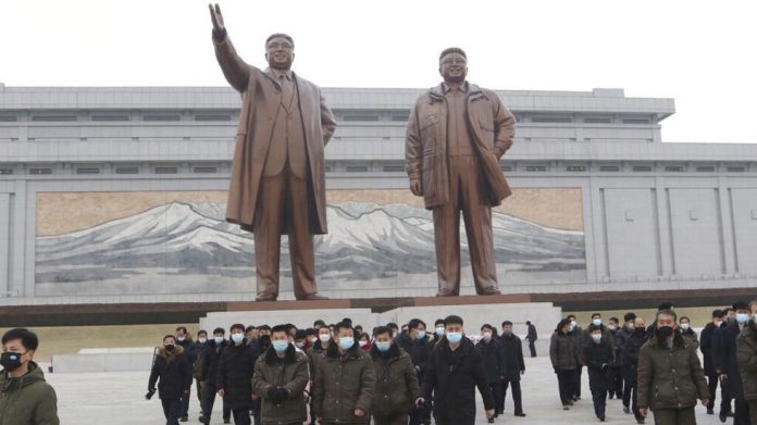 É o primeiro na cidade desde que o governo declarou vitória sobre a Covid-19, em agosto do ano passado. Norte-coreanos visitam local onde estão estátuas dos ditadores Kim Il Sung (pai, falecido) e Kim Jong Il (filho, atual líder) durante o feriado do Ano-Novo Lunar, em Pyongyang (22/01/23).