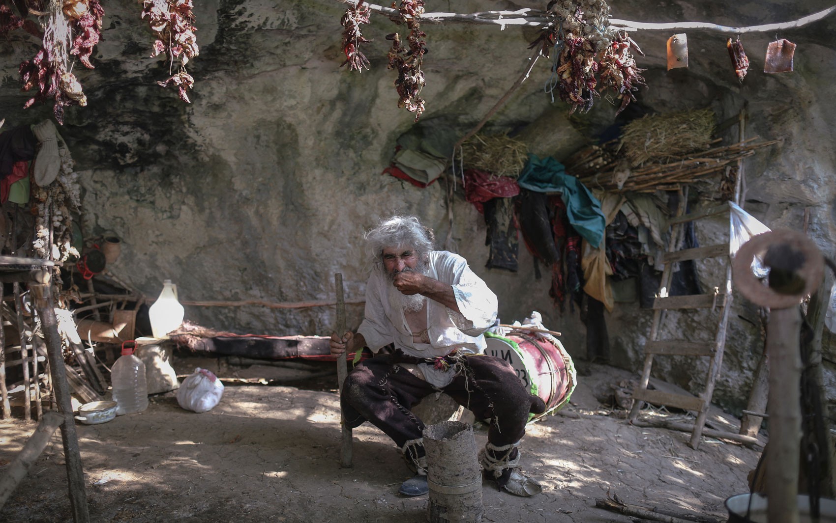 Panta Petrovic se mudou para uma pequena caverna há quase 20 anos, e faz poucas visitas à cidade. Ele soube da pandemia no ano passado e se vacinou assim que descobriu que poderia fazê-lo: O vírus ‘não escolhe, também vai chegar aqui…Quero receber as três doses (da vacina), incluindo a adicional’, diz. Panta Petrovic come em sua caverna perto da cidade de Pirot, em foto de 9 de agosto
