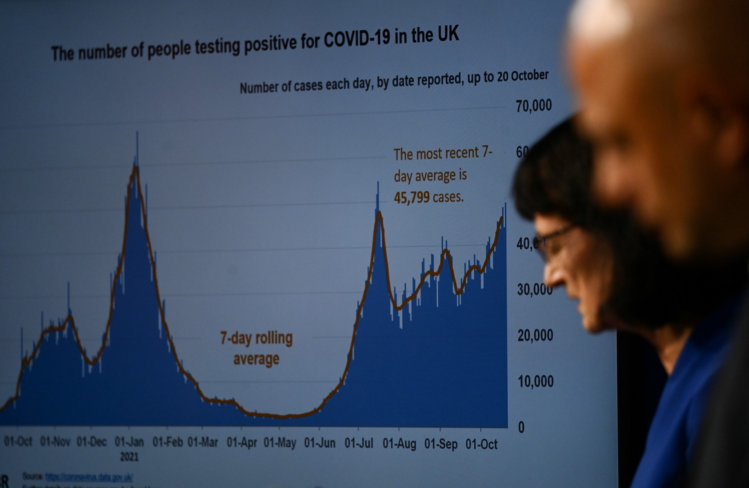 Vacinação estagnou entre os britânicos, e números recentes preocupam ainda mais pela chegada do inverno. Apesar da resistência do governo, um ‘Plano B’ com novas exigências não está descartado. Sajid Javid, ministro da saúde britânico, ao lado de painel com números do coronavírus no Reino Unido nesta quarta (20)