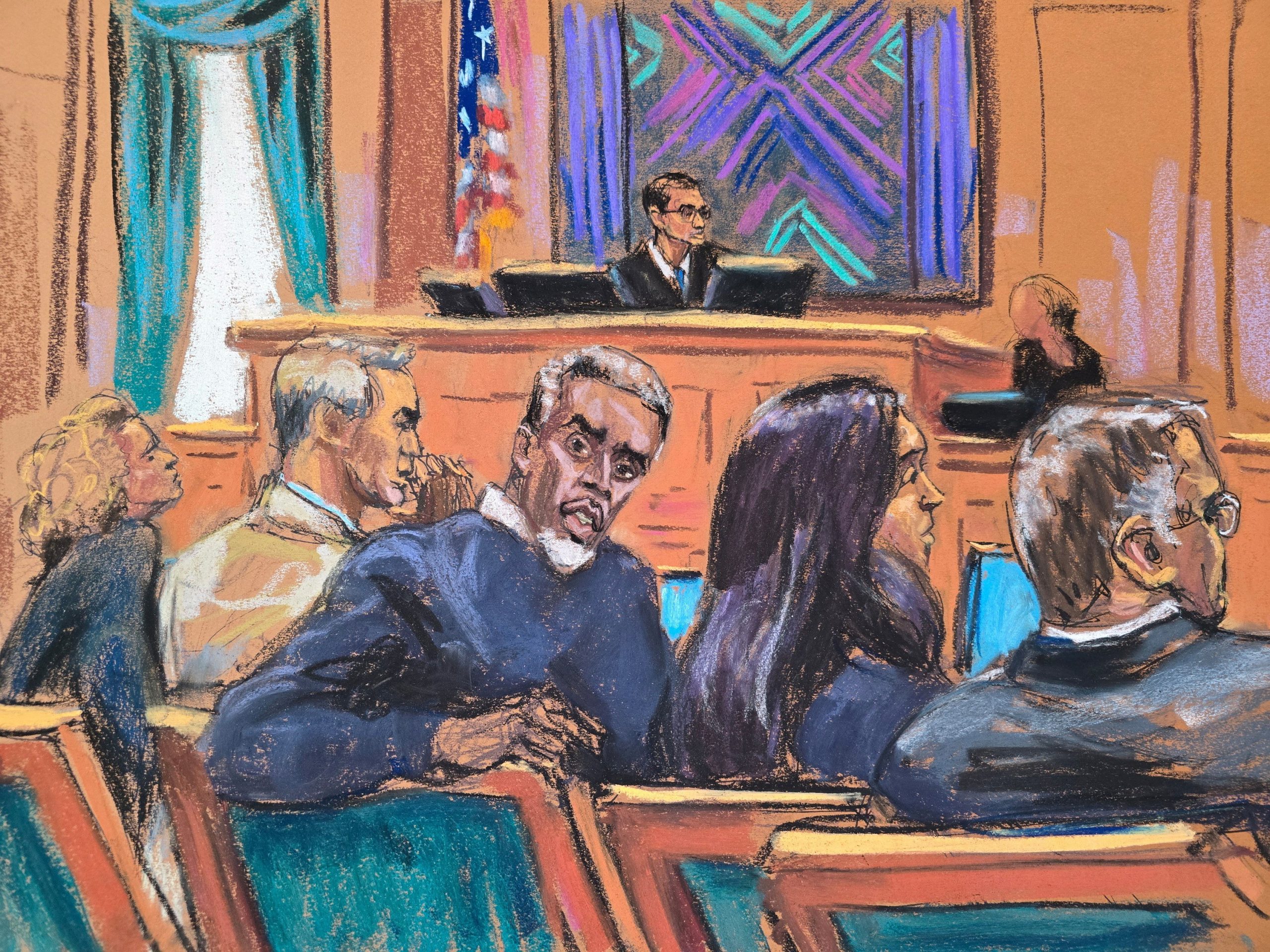 Ilustração mostra Sean ‘Diddy’ Combs em tribunal durante julgamento