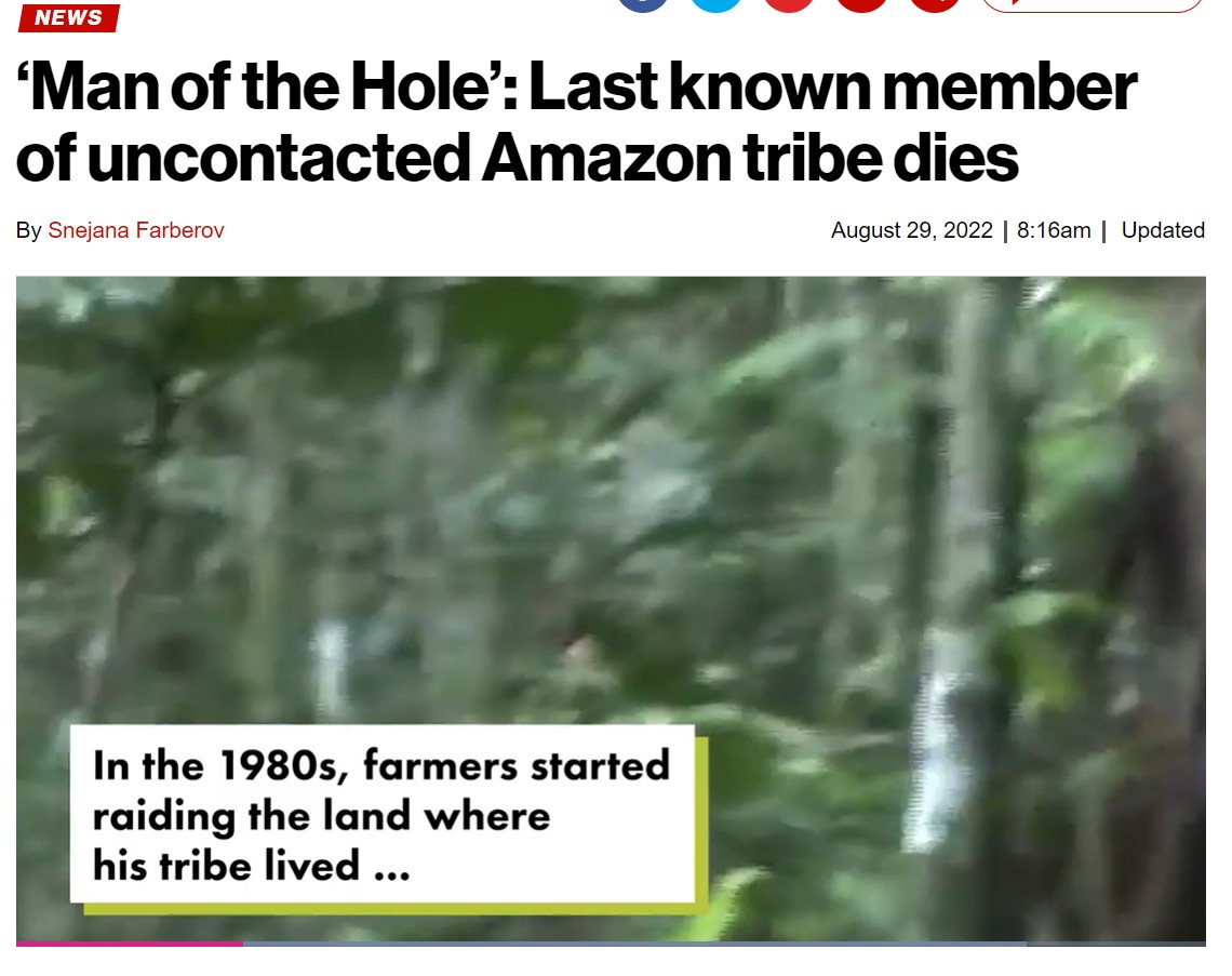 Em 1995, diz o texto, seis dos últimos membros foram assassinados por garimpeiros e foi assim que “o homem do buraco” se tornou o último da tribo.