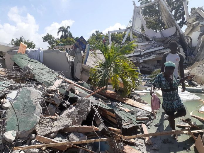 Mais de 2.800 pessoas estão feridas e quase 3 mil construções foram destruídas; situação é pior no sul do país, onde mais de 500 morreram. Primeiro-ministro decretou estado de emergência por 30 dias e novo tremos foi registrado neste domingo. Pessoas caminham entre escombros de casas destruídas pelo terremoto em Les Cayes, no Haiti