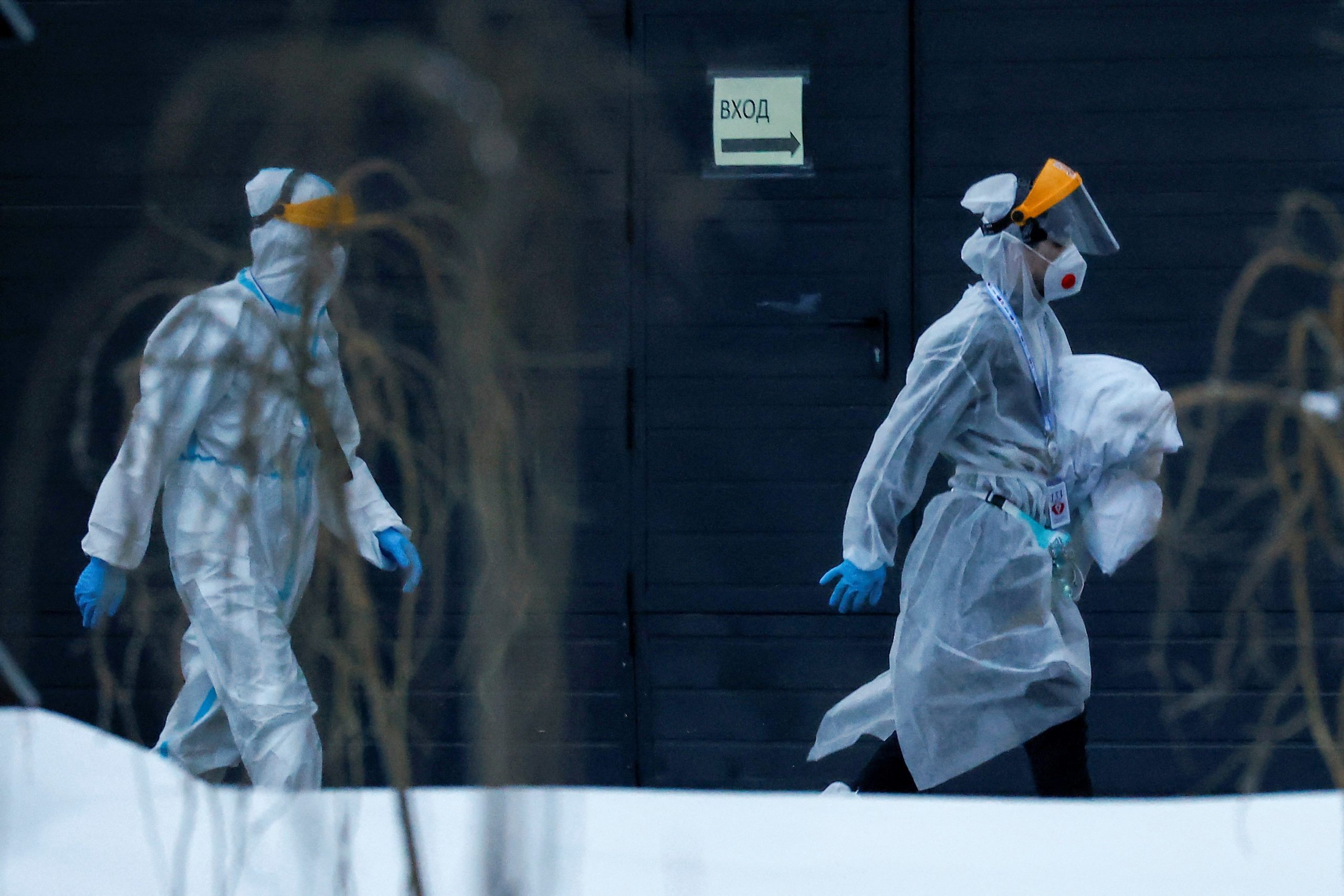 Foram mais de 168 mil casos de coronavírus e 682 mortes por complicações da doença em 24 horas. Médicos com trajes de proteção caminham do lado de fora de hospital dedicado ao tratamento de pacientes com Covid-19 em Moscou em 1º de fevereiro de 2022