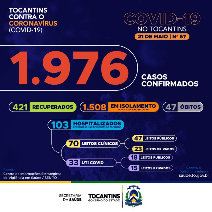 A Secretaria de Estado da Saúde (SES) confirmou cinco novas mortes por coronavírus e 168 novos casos da doença no Tocantins. Com as confirmações desta quinta-feira (21), o estado passa a ter 47 óbitos e 1.976 pessoas com o diagnóstico.
