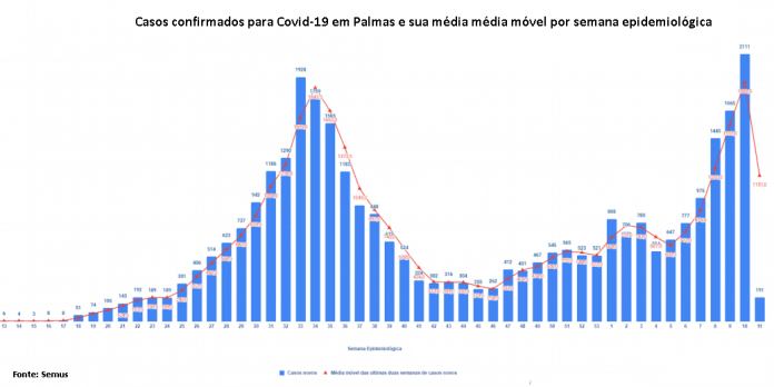 A projeção do monitoramento da Covid-19 em Palmas é de, entre os dias 14 e 20 de março de 2021 (SE 11), sejam confirmados 3.419 casos novos da doença. Atualmente, o percentual de positividade dos testes para Covid-19 está se mantendo em torno de 40%.