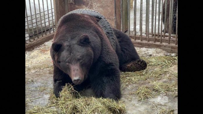 O urso Fyodor ficou preso em um pneu enquanto tentava brincar com ele, em um parque na Rússia