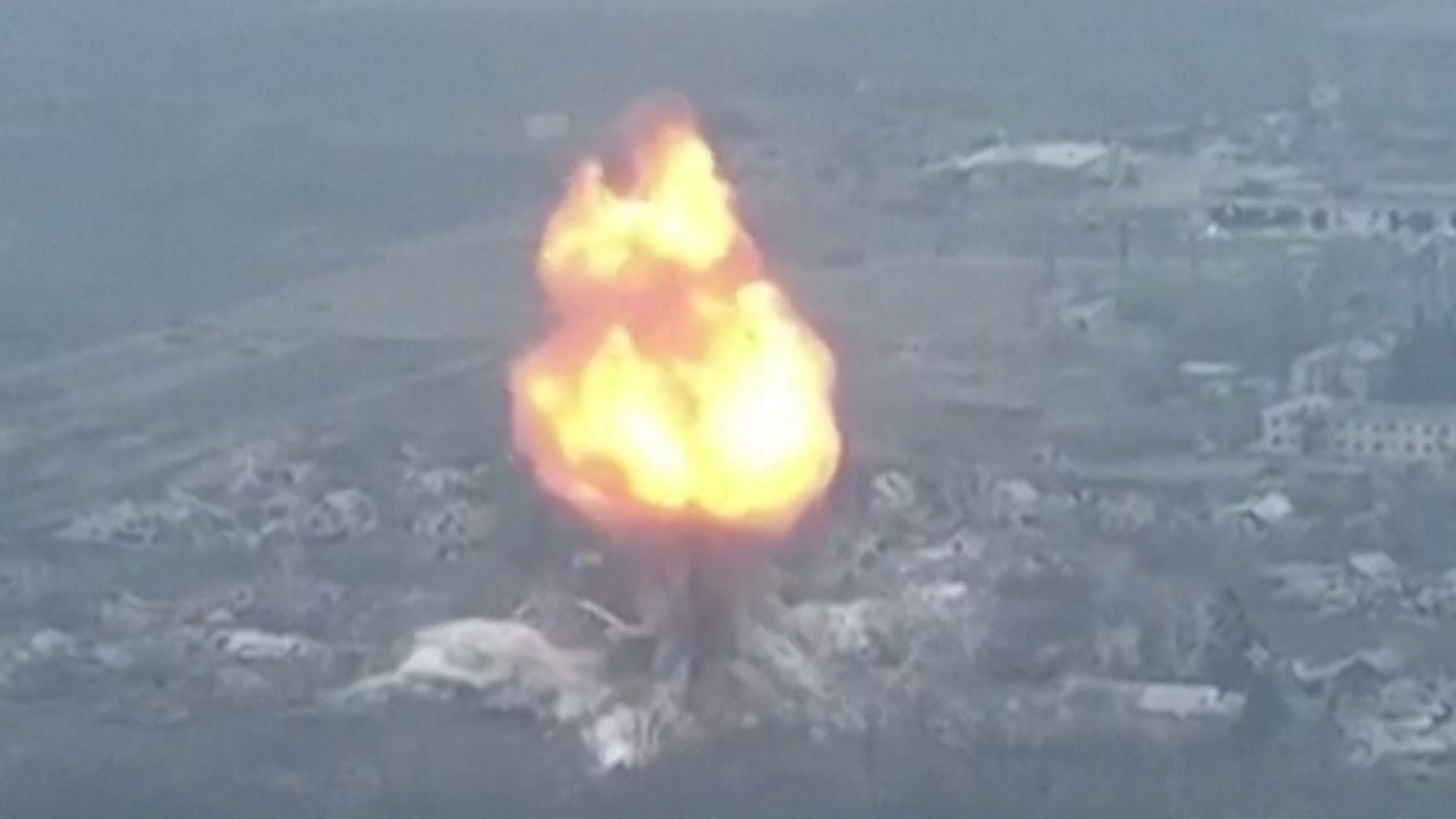 Imagens de drone mostram explosão em galpão na cidade de Bakhmut, na Ucrânia