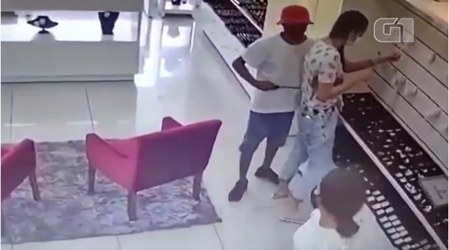 Uma testemunha informou ao G1 que o crime aconteceu por volta das 14h30. As imagens mostram o homem entrando na loja e retirando uma faca na cintura. Ele se aproxima de uma mulher por trás e anuncia o assalto.