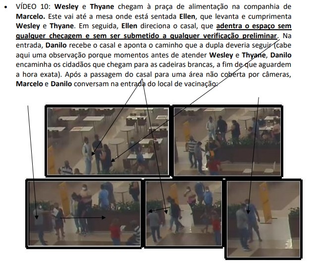 Conforme o Ministério Público, “Wesley e Thyane chegam à praça de alimentação [do shopping onde era aplicada a vacinação] na companhia de Marcelo [amigo apontado pelo MP. Este vai até a mesa onde está sentada Ellen, que levanta e cumprimenta Wesley e Thyane. Em seguida, Ellen direciona o casal, que adentra o espaço sem qualquer checagem e sem ser submetido a qualquer verificação preliminar”