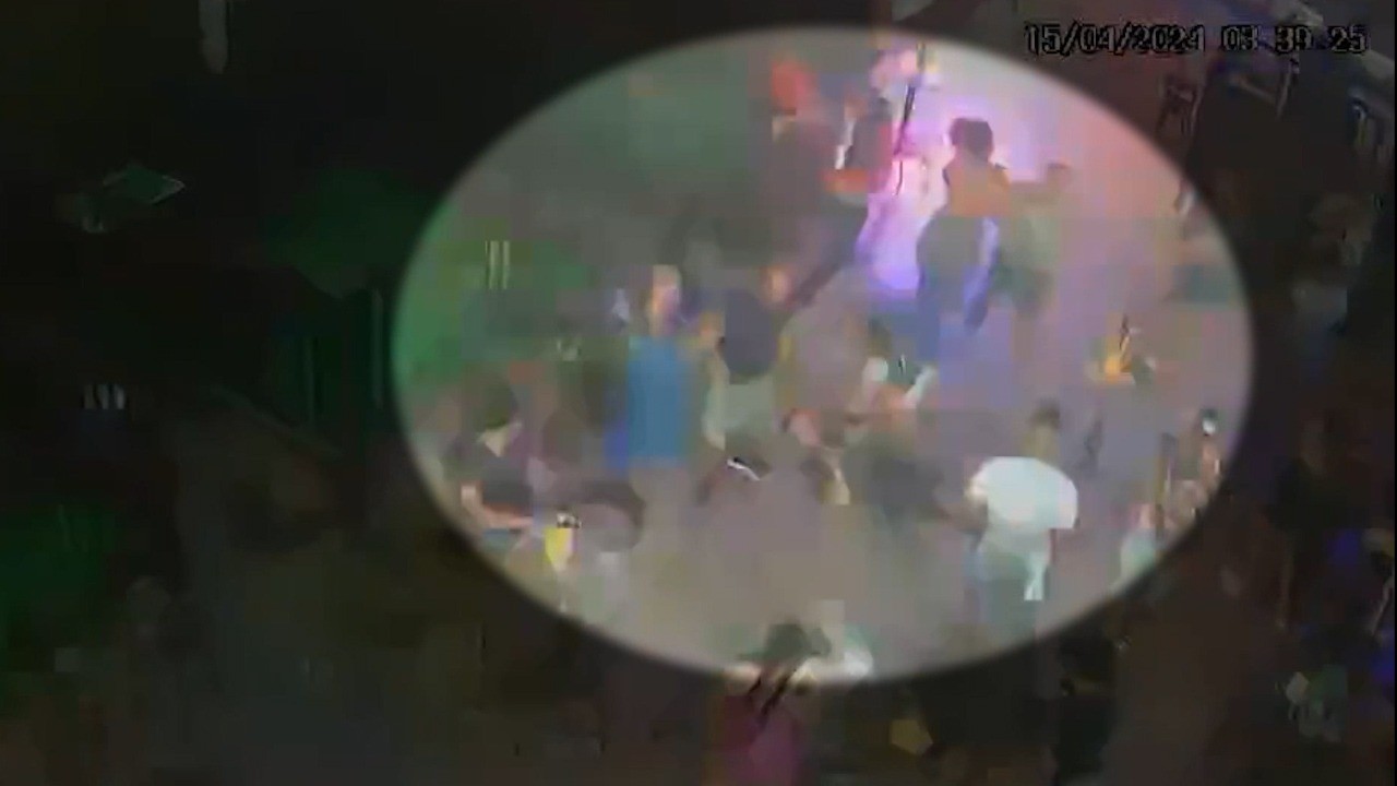 Equipamentos de dois ângulos registraram a confusão. É possível ver que pouco depois das 3h30, dois homens estão conversando com uma mulher e outros três estão bem próximos, abraçados. Logo depois outros homens se juntam ao trio.
